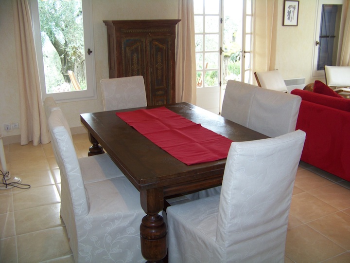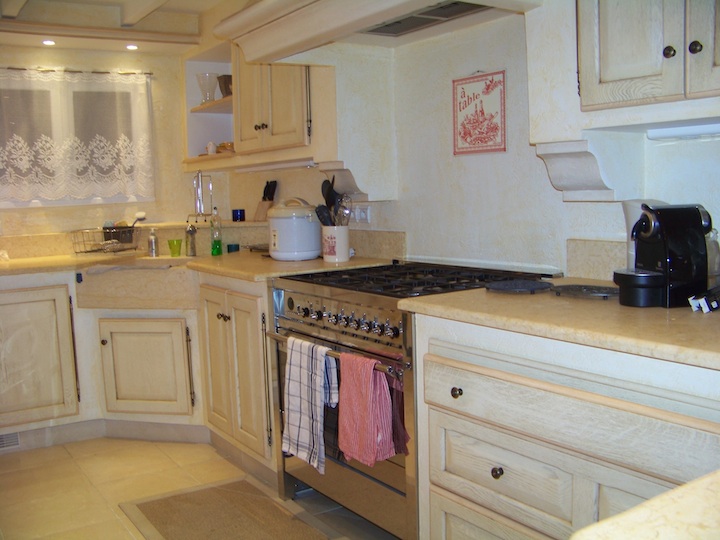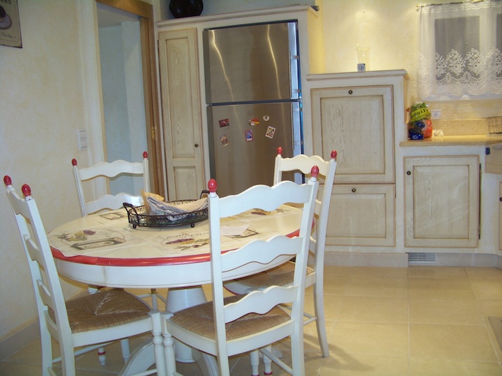 The fully equipped kitchen is very large and has a table and 4 chairs. The Provencal style furniture is lovely and the decoration is done with good taste.