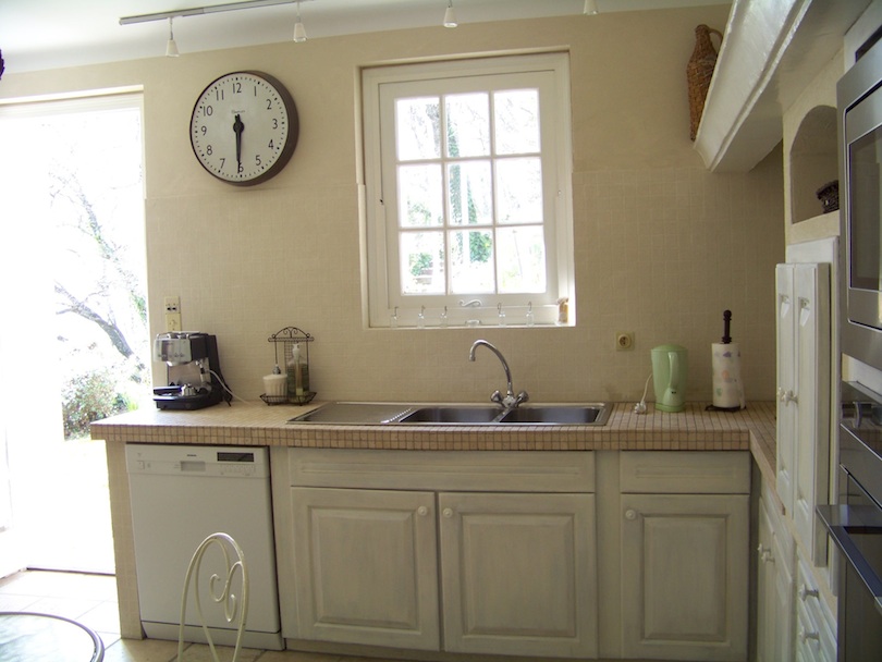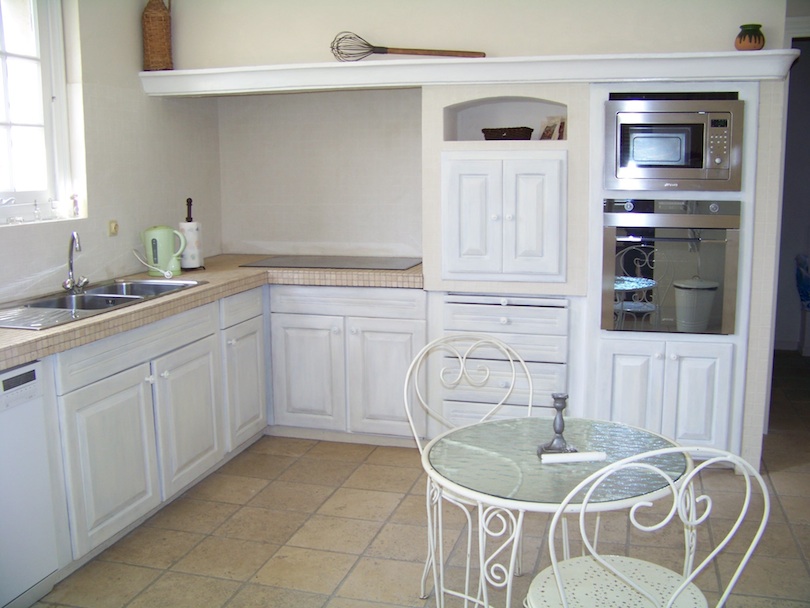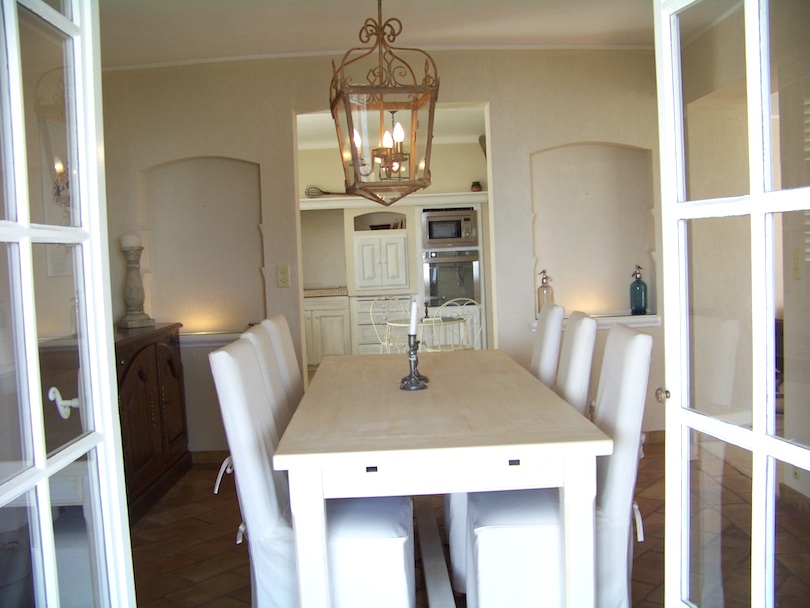 The kitchen is fully equipped and opens onto the dining room with a long table and chairs that can accommodate a large family .