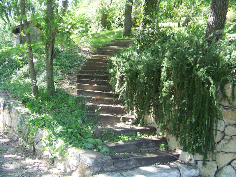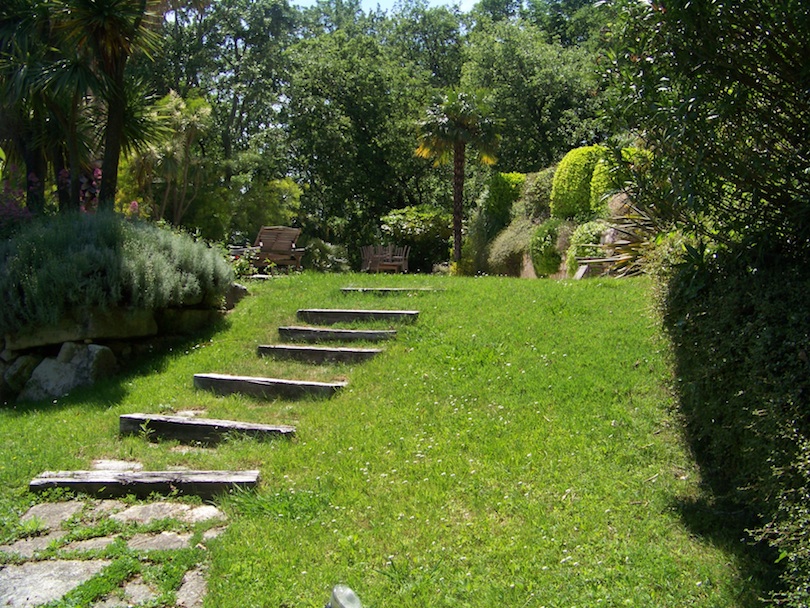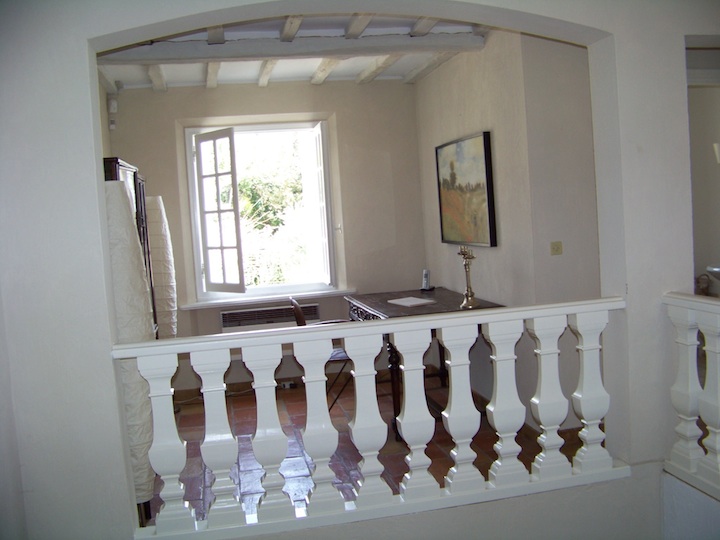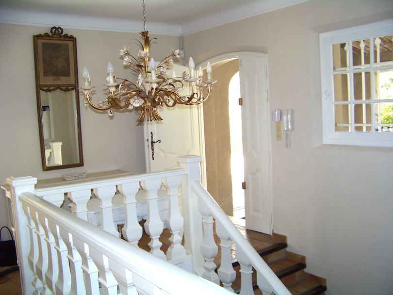 A lovely majestic staircase takes you down to the main living area and out door terrace and garden .