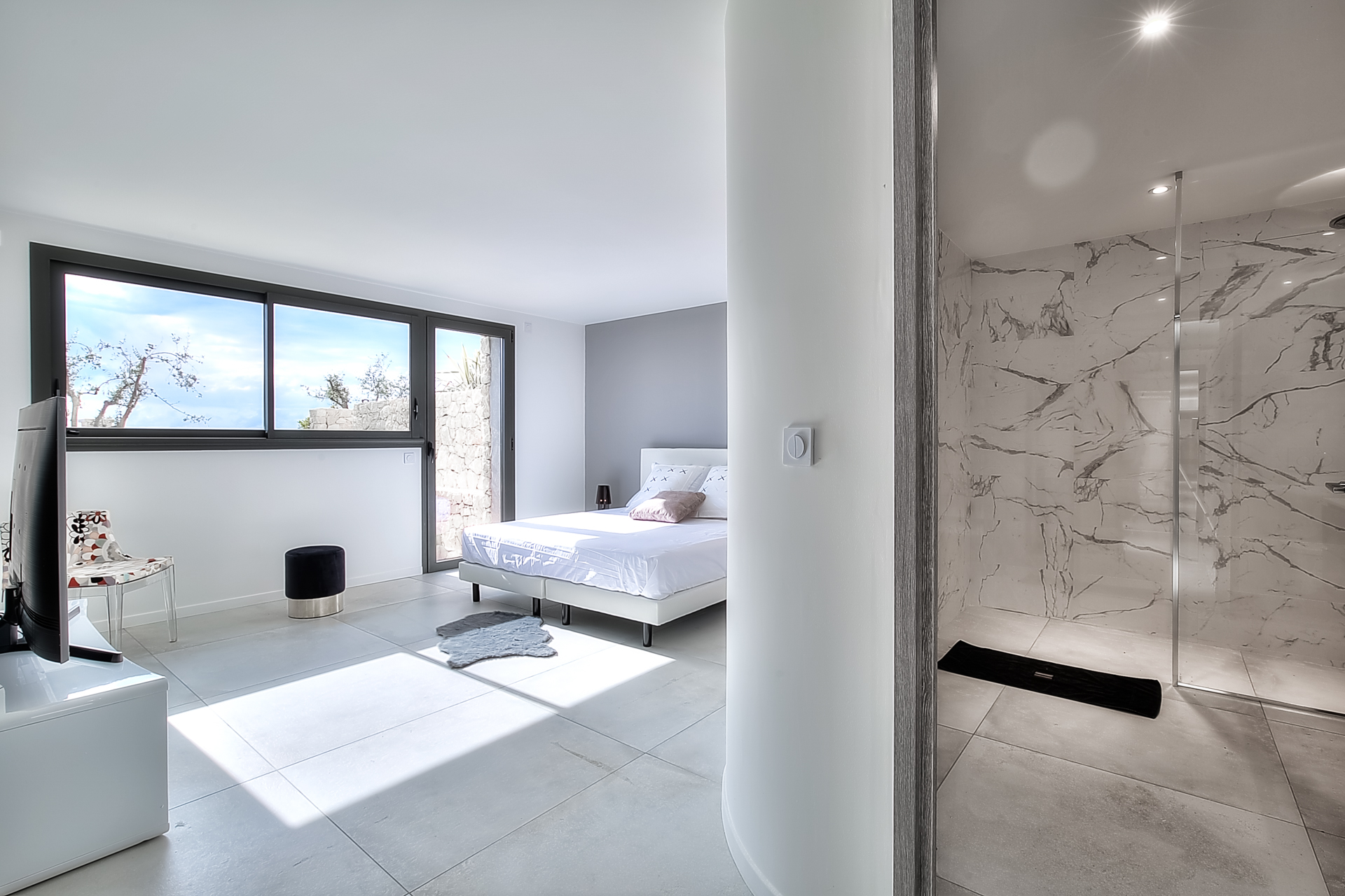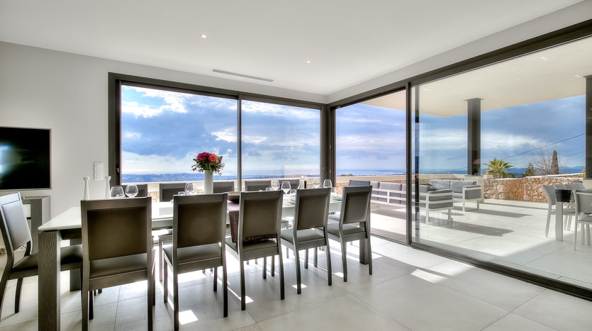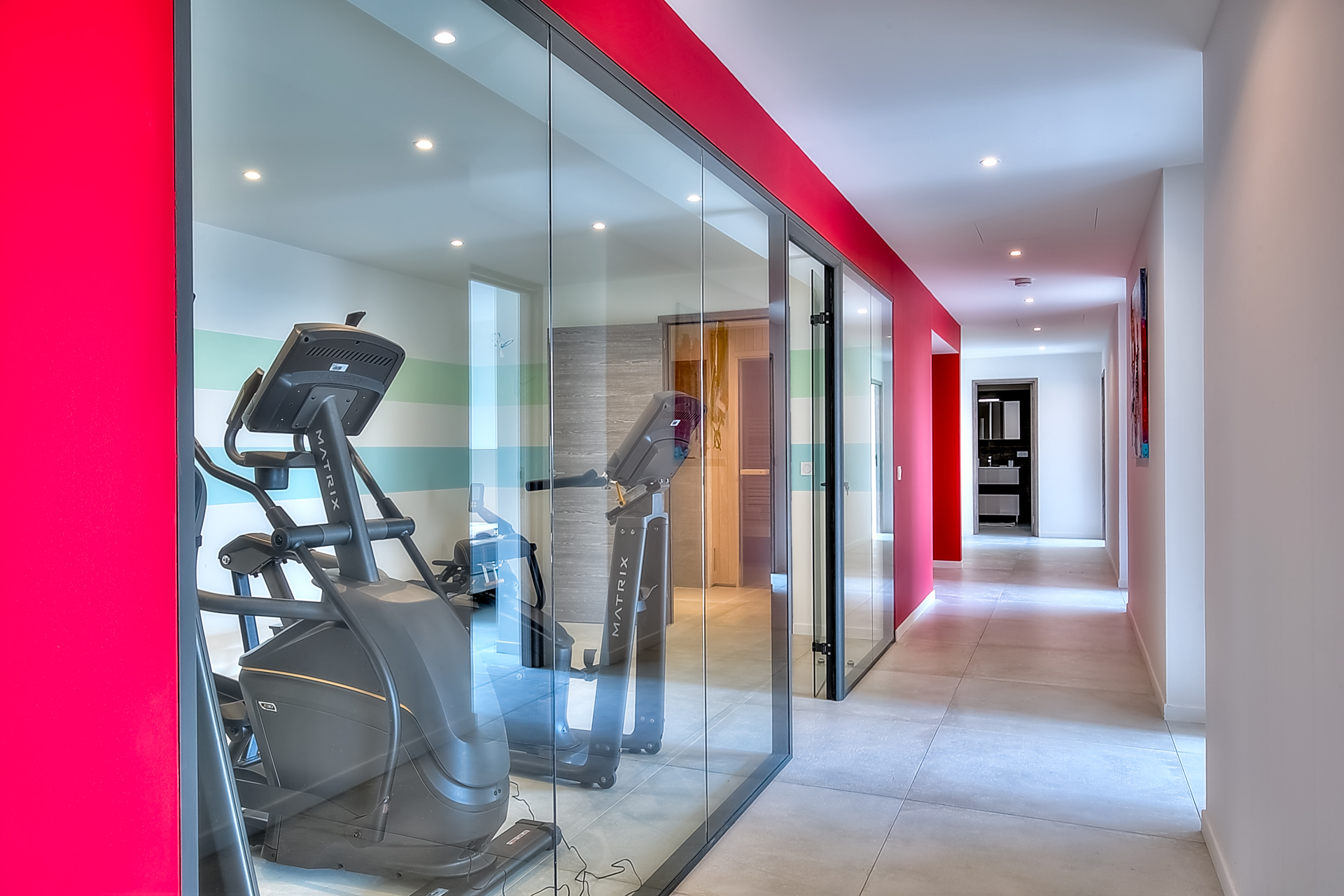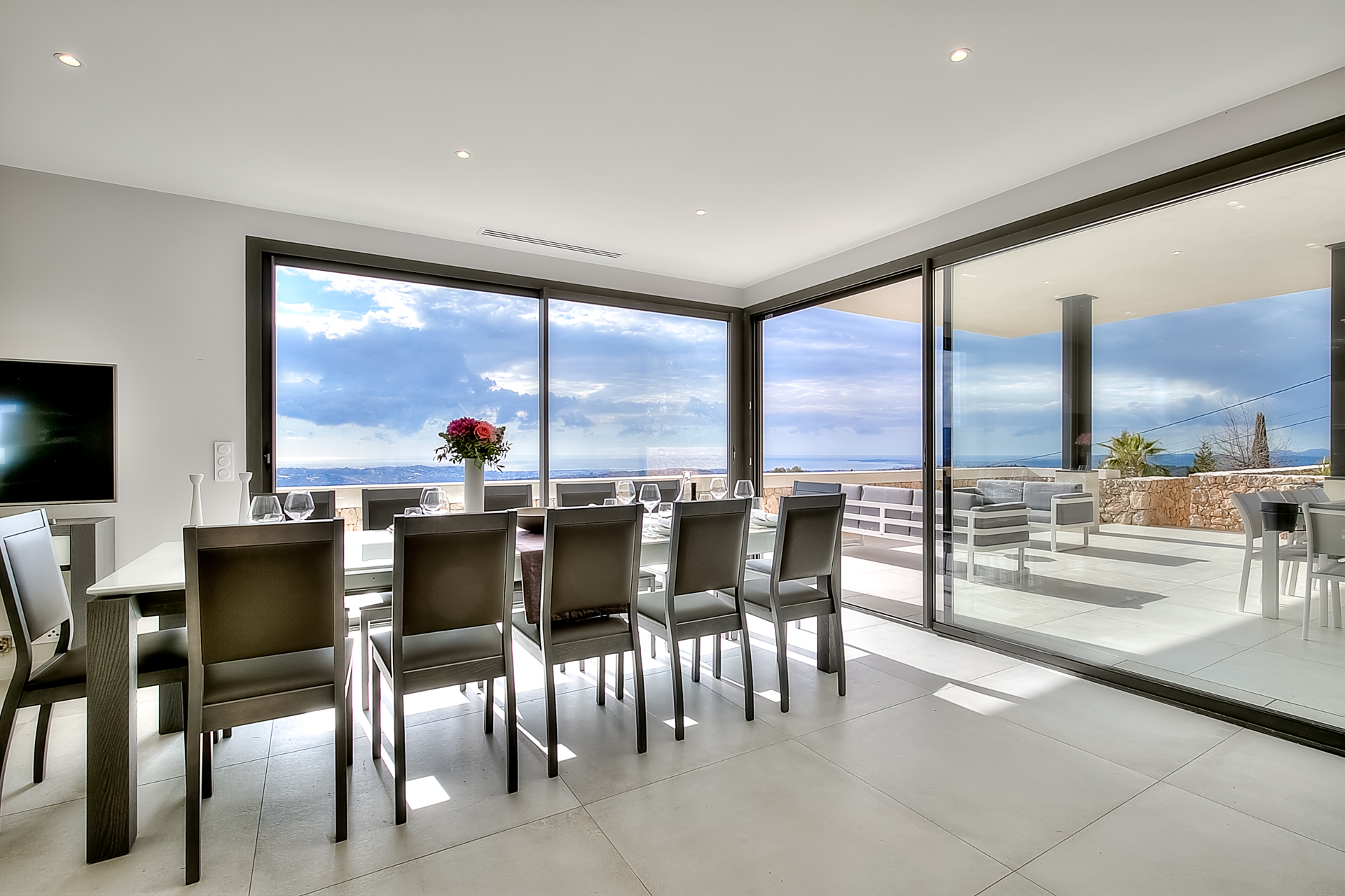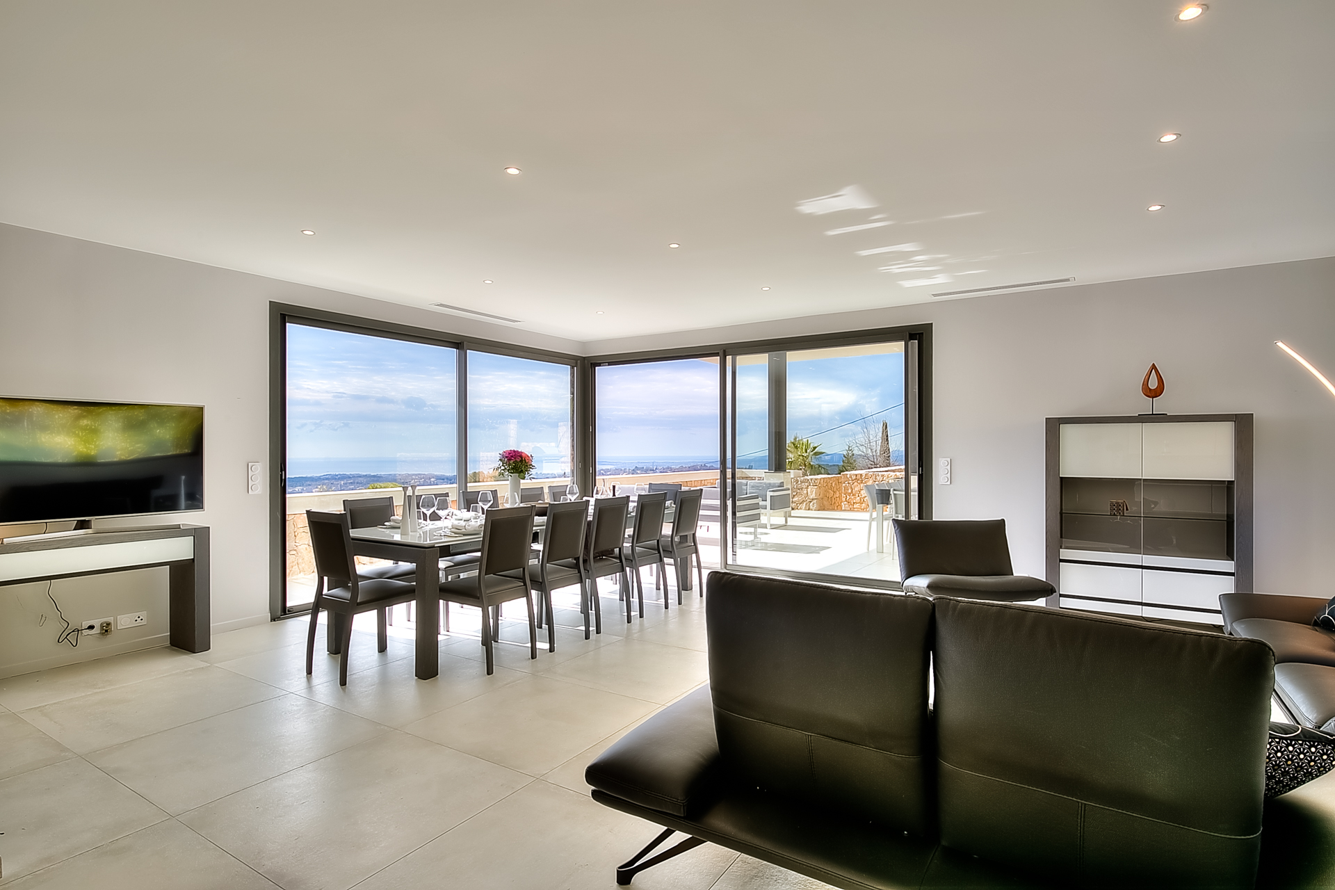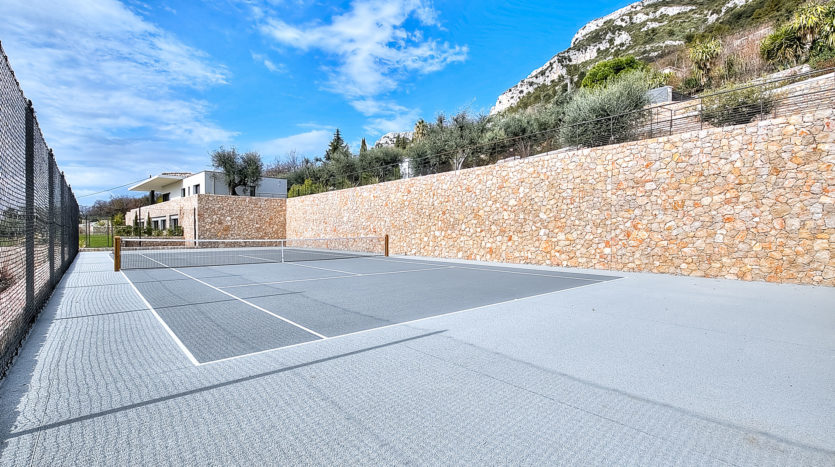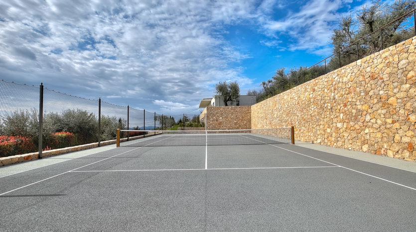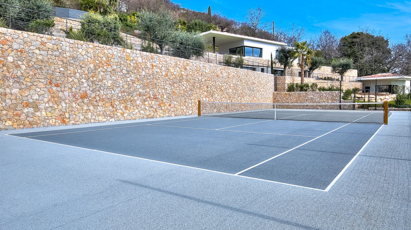 So all together the property offers a spacious and modern living area, a large terrace with bbq, 6 spacious bedrooms, 5 bath/shower rooms, a gym room a lovely pool and a tennis court . The most view is amazing . You can see the coast from Nice to Cap d’Antibes , cannes and the Esterel hills .