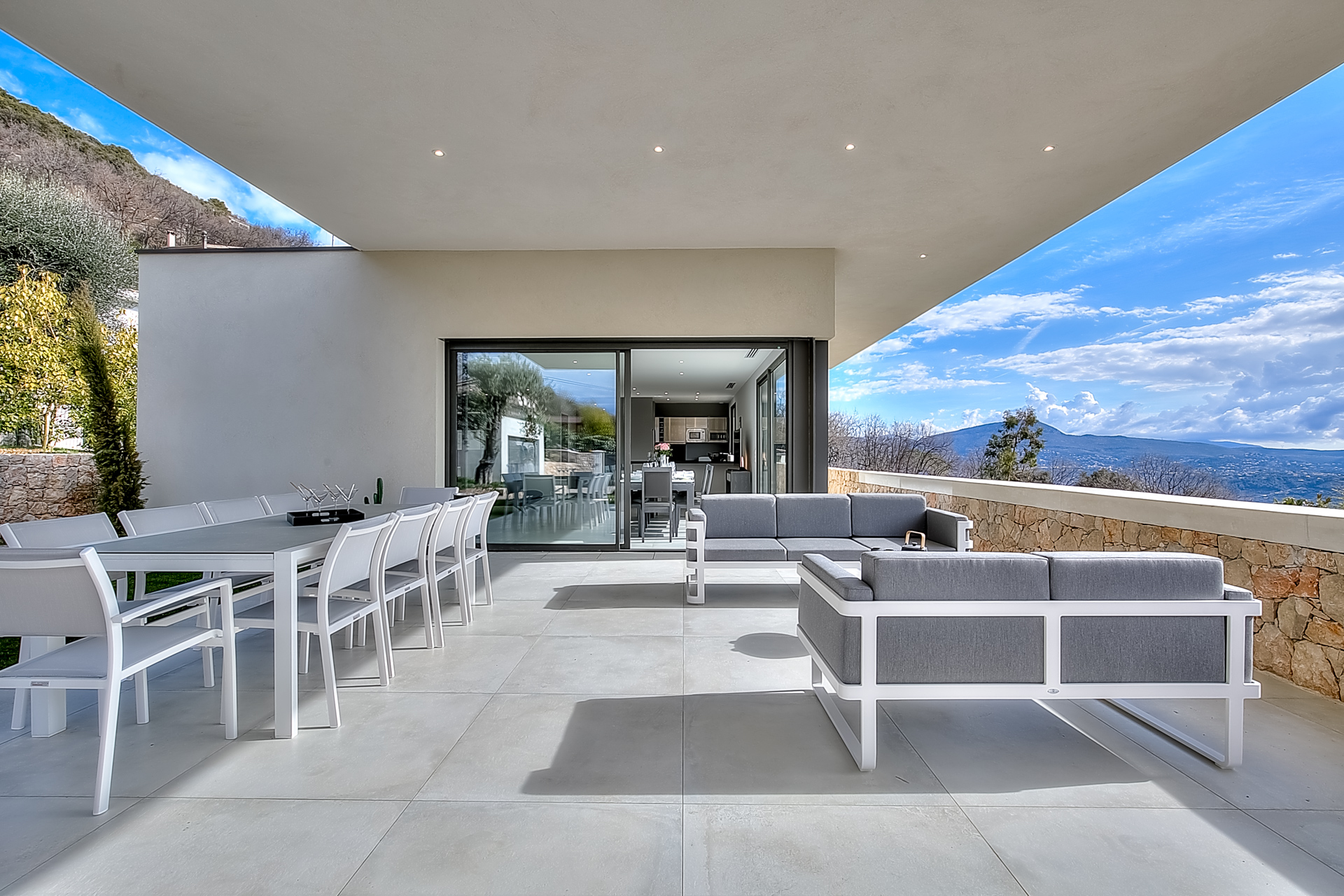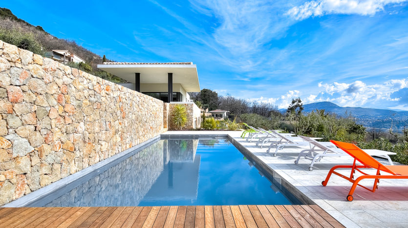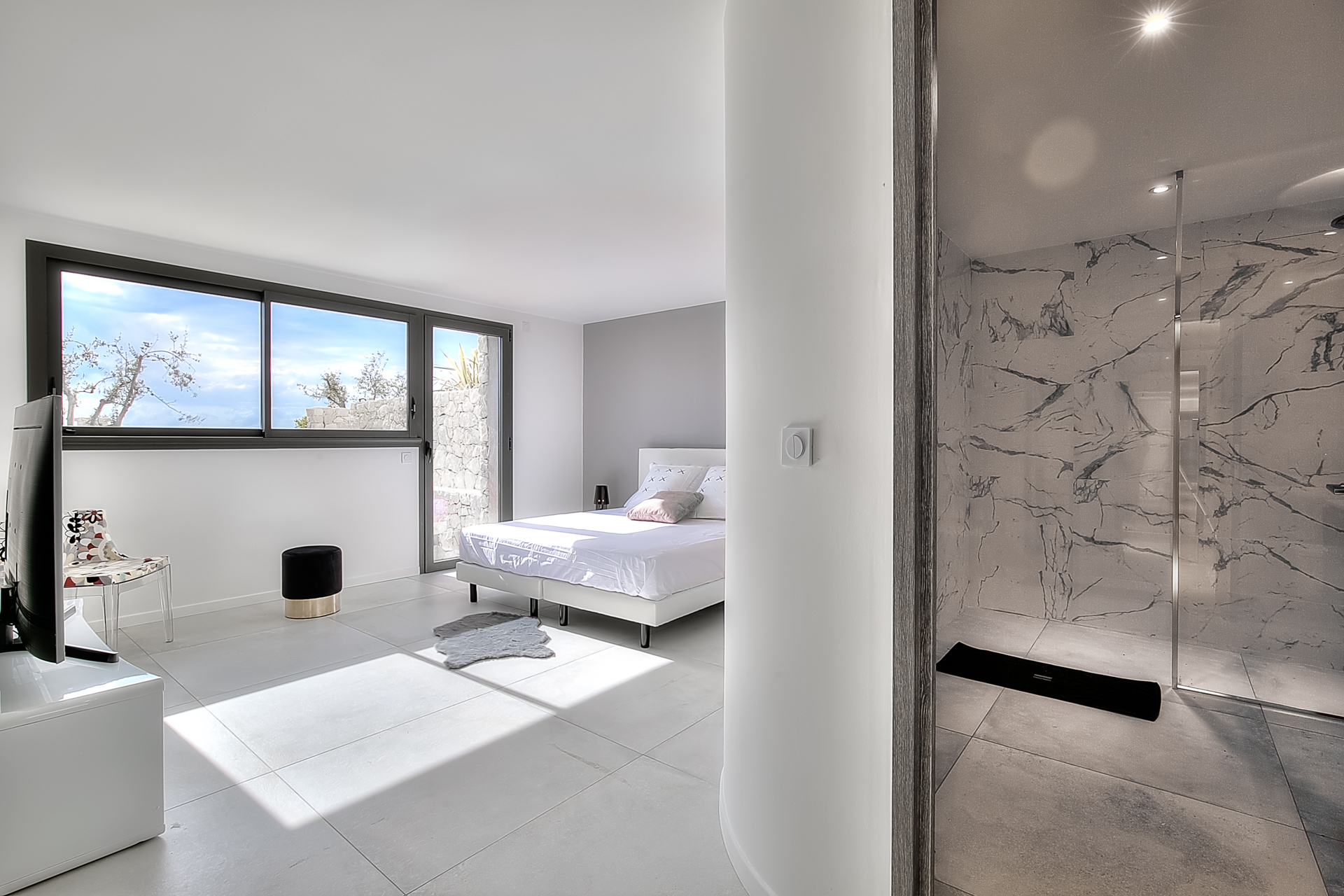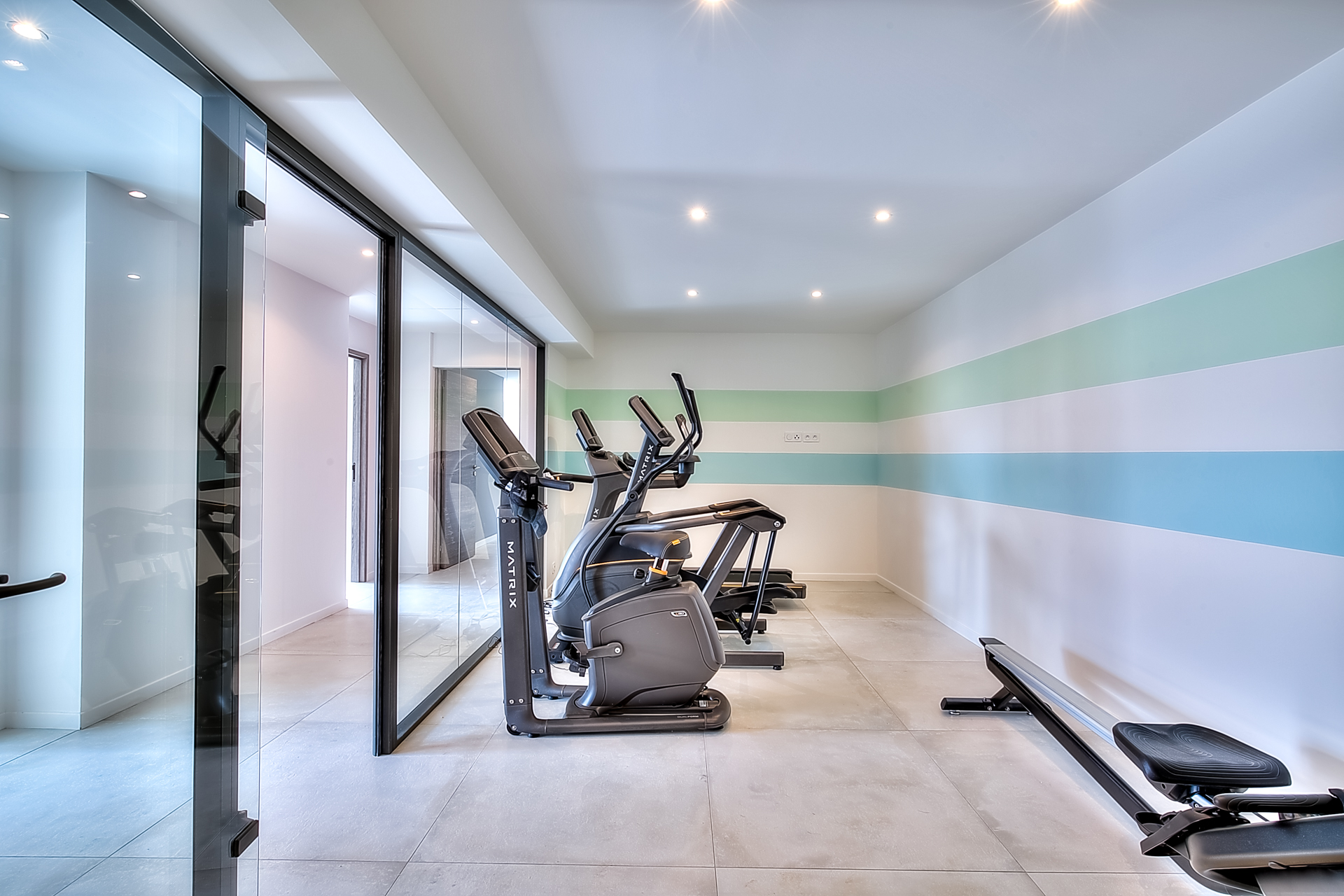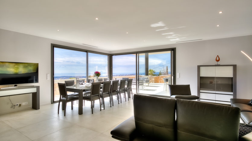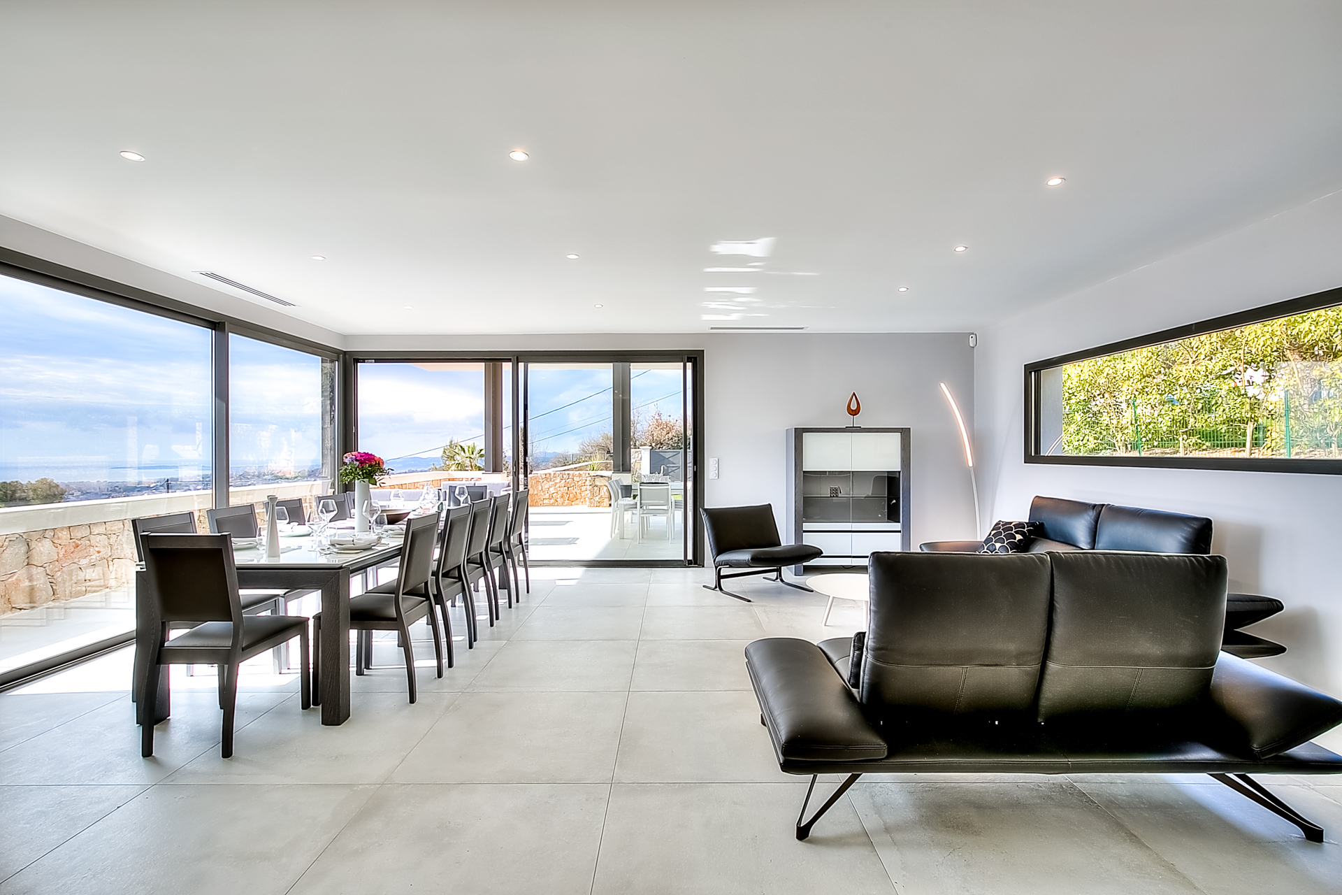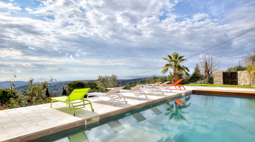 So all together the property offers a spacious and modern living area, a large terrace with bbq, 6 spacious bedrooms, 5 bath/shower rooms, a gym room a lovely pool and a tennis court . The most view is amazing . You can see the coast from Nice to Cap d’Antibes , cannes and the Esterel hills .