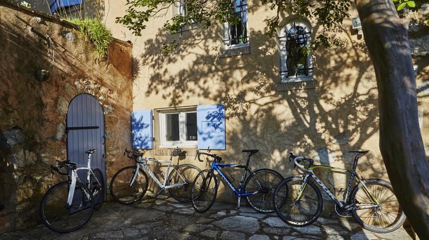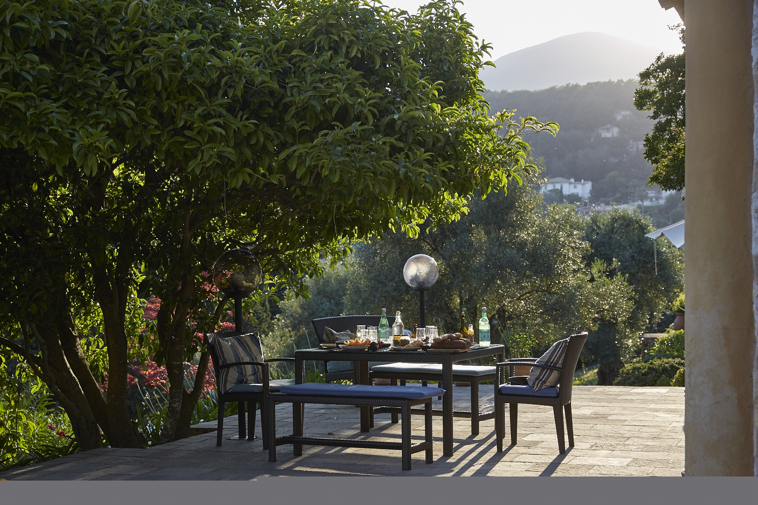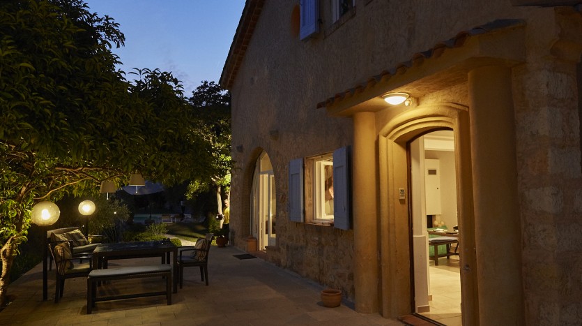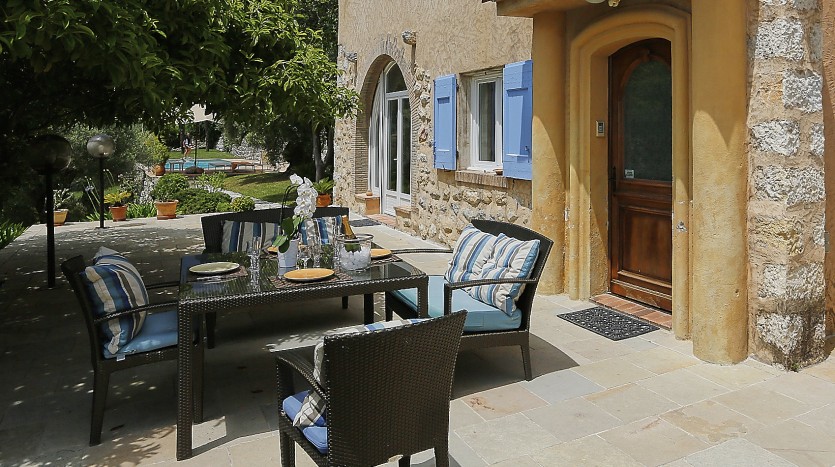 As you walk in you enter a spacious living area with a fire place, 2 sofas and a large table. The kitchen is fully equipped. The living area has 2 large french windows opening onto the terrace that leads to the garden and to the very secluded pool.