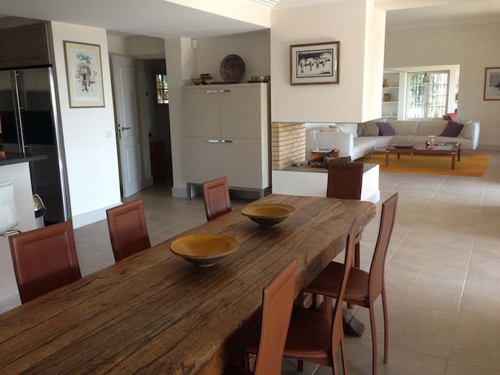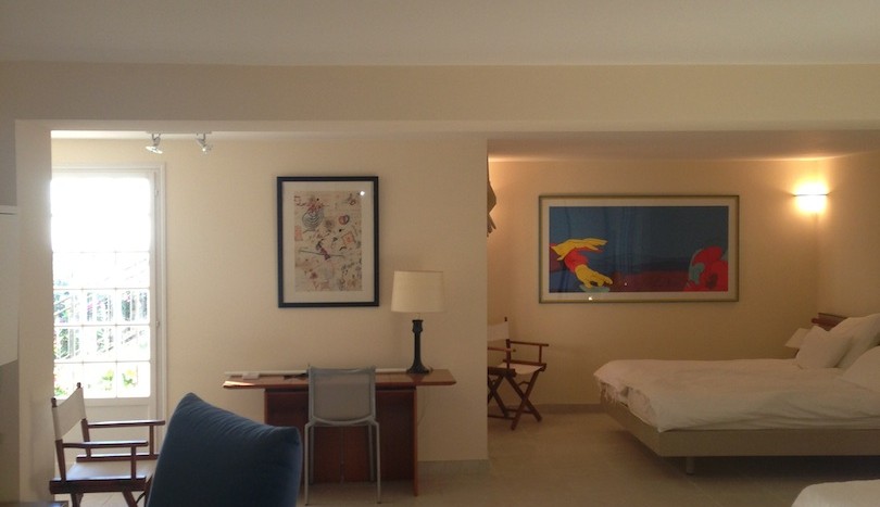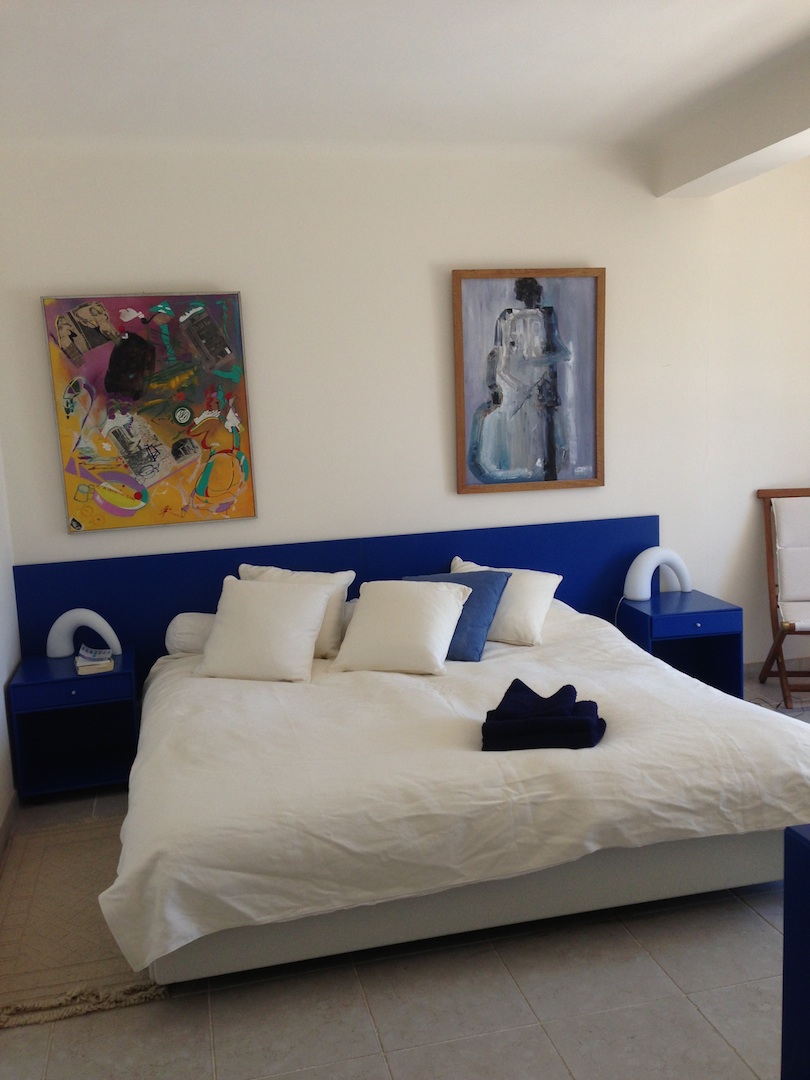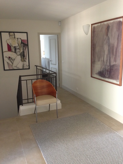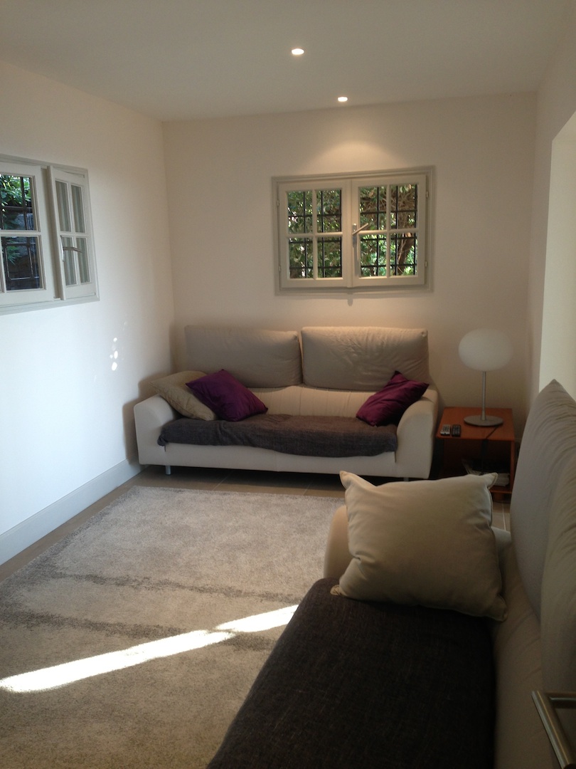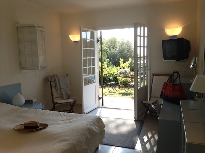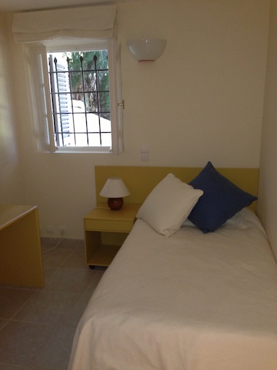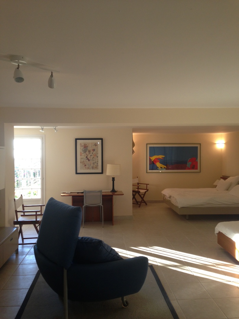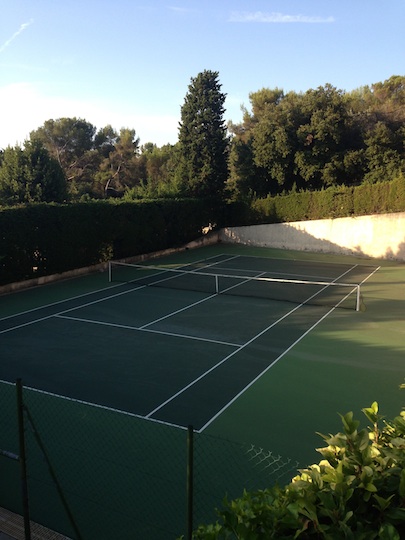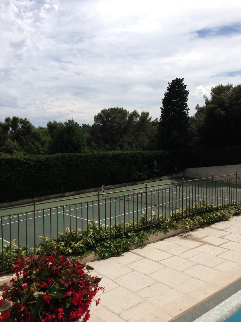 The rooms on the first level lead out to a veranda. The veranda has an outdoor dinning table that seats up to 8 people and relaxing lounge area. Off the veranda is a sloping staircase that leads to our Olympic size swimming pool. The pool area has 8 sunbeds, and  outdoor lounge seating; four chairs with cushions, a ottoman and two patio umbrellas. Surrounding the pool is a meticulously cared for garden that is graded to extend over the hillside.  Professional tennis court sits below the pool area and has a basketball hop for playing one-on-one basketball.  Off the tennis courts is a covered outdoor terrace for the fans wanting to watch your tennis game. Below the veranda is a summer kitchen – cuisine d ete – There is a demi loom bar that seat up to six people.  The open kitchen is equipped with dishwasher, refrigerator/icemaker, deep freeze and sink.  The open kitchen has a large dinning table that seat up to 10 people.  PingPong table and tennis rackets are stored in the summer kitchen. The second level has three bedrooms, a studio and laundry room. All the bedrooms have private baths, closet space, dresser/desk and twin beds. The laundry room is equipped with newly installed Bosch washer/dryer , sink, ironing and countertop for folding. The studio has a refrigerator, large closet space, storage area, and four twin beds.  The studio has access onto the outdoor kitchen/gardens.  The bathroom has a double sink and shower.